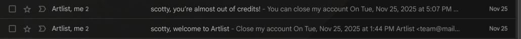 So I signed up for Artlist.io service on a discount for $19.99 a month to try Sora 2 Pro AI out, this was a BlackFriday promo they were offering. I figured it might be a good time to try Sora Pro 2 but Artlist.io had no intention of delivering on my membership of 55 vids as a matter of fact, you can see in the email screenshots below I signed up at 1;44 Nov 25th, and at 5:07 same day and 2 vids very poor vids the $19.99 16,500 credits have been exhausted.