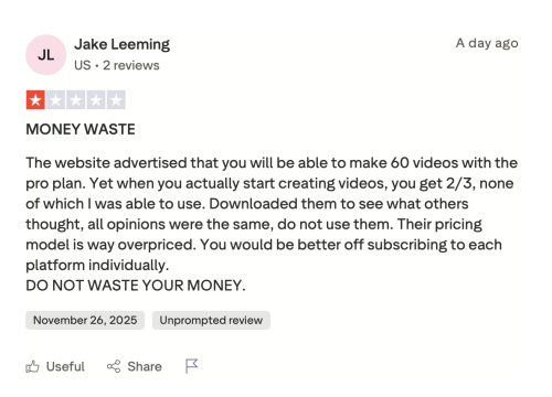 - Underwhelming AI tools: Generations are inconsistent (e.g., “walk” prompts result in jumps), credits deplete quickly on short outputs, and results look “awful” or low-quality—users feel it’s overpriced and not worth the hype.