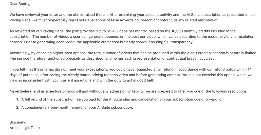 The reason I’m suing is I’m dying to find out: after paying $19.99 and only getting 2 videos, with no more Artlist.io credits left and not being able to edit my prompts on the AI videos I generated—has anyone actually gotten anywhere near the 55 videos or 206 images they promised? I’m doing my best to investigate going though their AI models, but without those credits, it just doesn’t seem possible to hit anywhere close to the numbers they quoted me at signup and I think this is where bringing Stripe into this too in important, they are taking payments for these scammers.